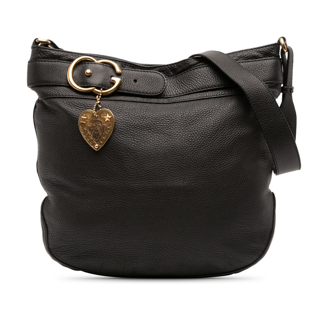 This shoulder bag features a leather body, an adjustable flat leather strap, an open top, and interior zip and slip pockets.