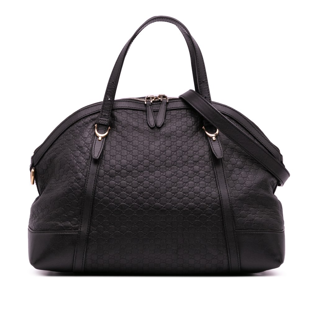 This satchel features an embossed leather body, flat leather handles, a detachable flat leather shoulder strap, a top zip closure, and interior slip and zip pockets.