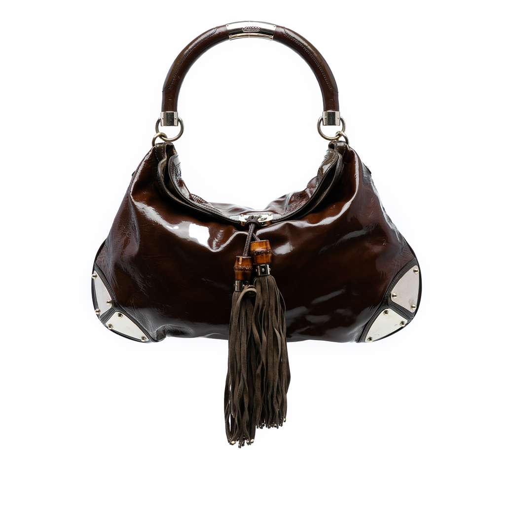 The Indy hobo bag features a patent leather body with metal corners, a rolled handle, a fold-over flap closure with tassel details, and an interior zip pocket.