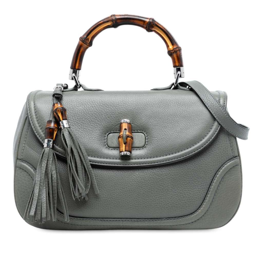 This satchel bag features a leather body, a bamboo top handle, leather tassel details, a front flap with a bamboo twist lock closure, and interior zip and slip pockets.