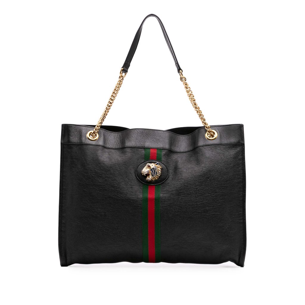 This tote bag features a leather body and a gold-tone tiger head detail, curb chain straps, an open top with a magnetic closure, and an interior zip pouch.