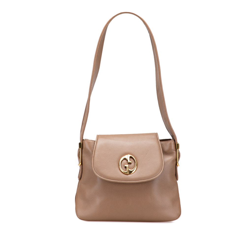The 1973 shoulder bag features a leather body, a flat leather strap, top flap with a magnetic button closure, and interior slip and zip pockets.