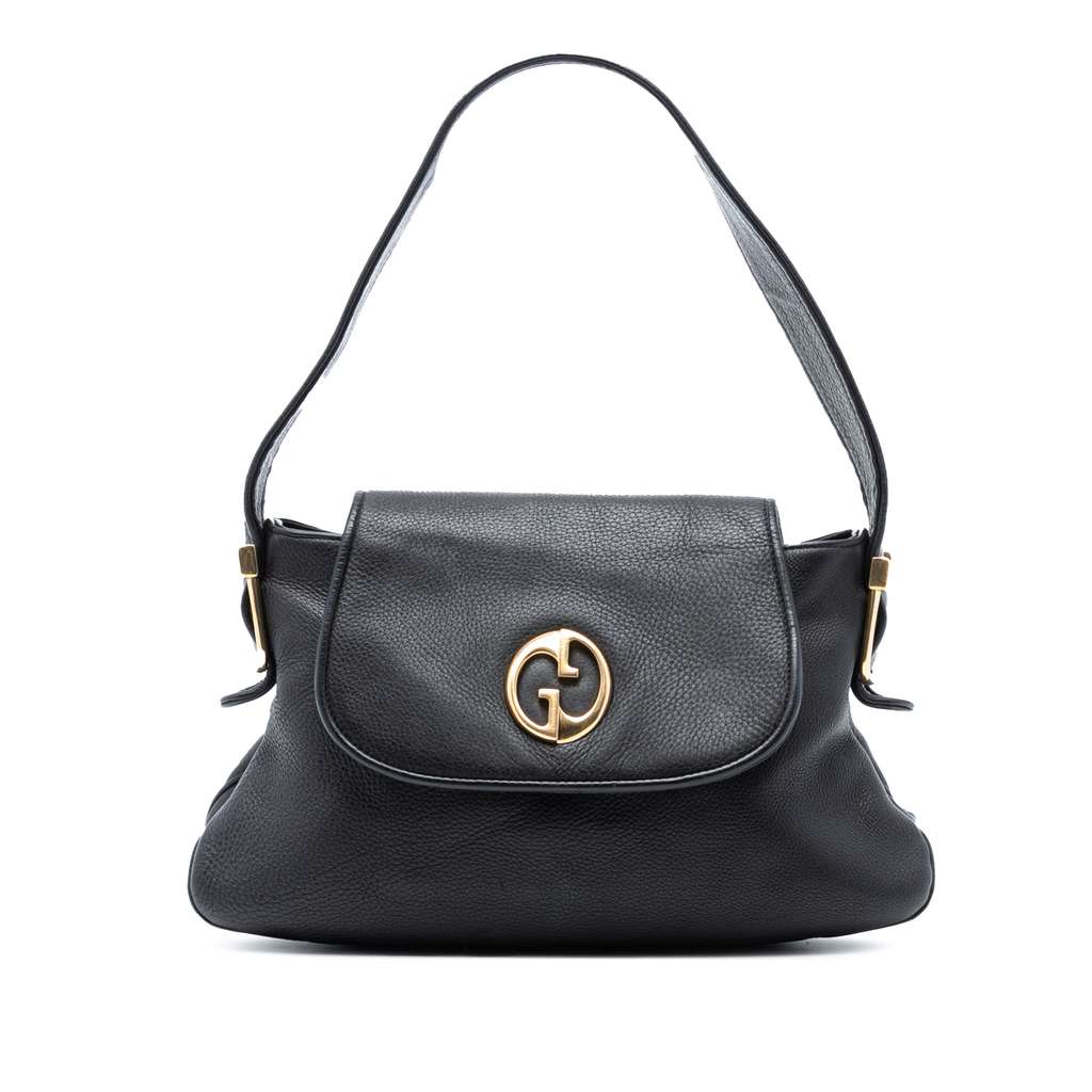 The 1973 shoulder bag features a leather body, a flat leather strap, a front flap with a magnetic closure, and interior zip and slip pockets.