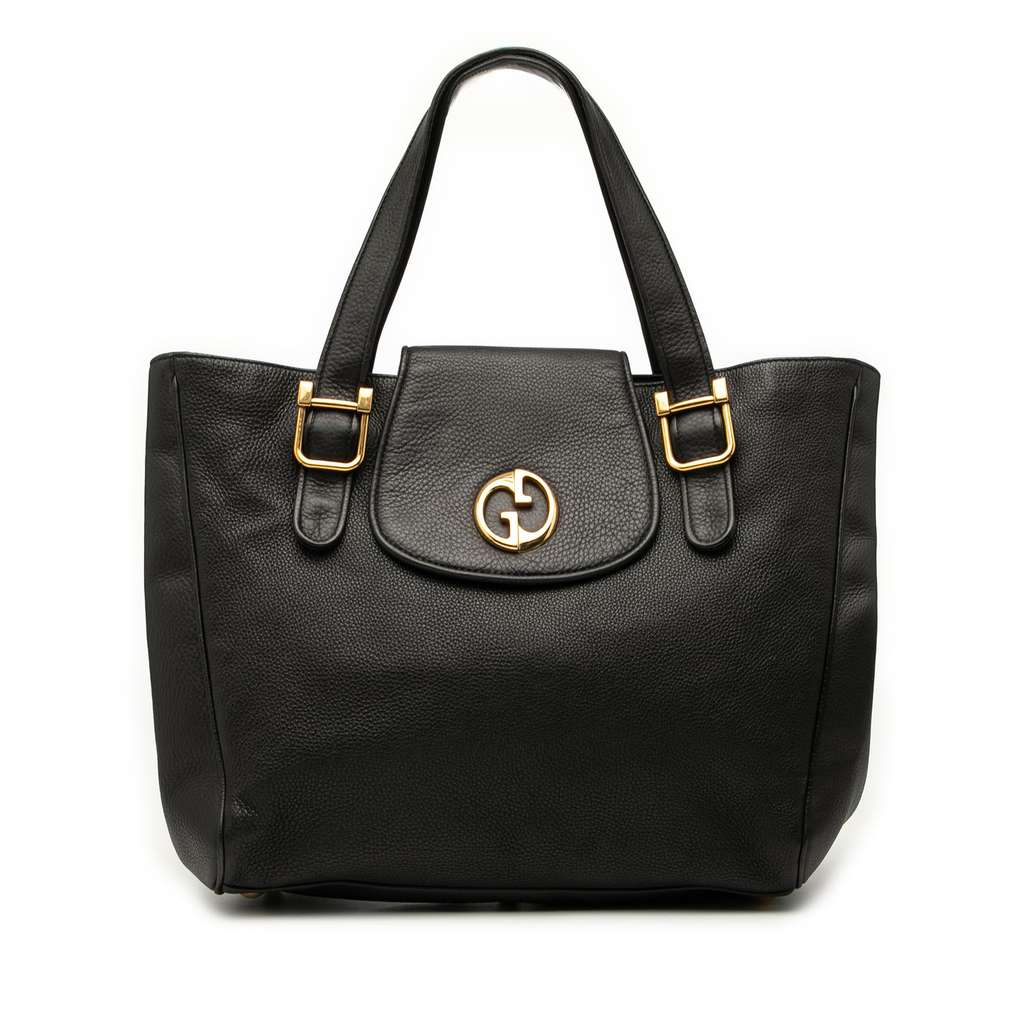 The 1973 tote bag features a leather body, flat straps, a top strap with a gold-tone double G detail and magnetic closure, and interior zip and slip pockets.