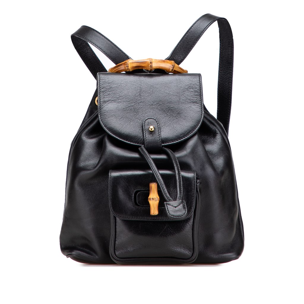 This backpack features a leather body, a bamboo top handle, flat leather back straps, a top flap, a drawstring closure, an exterior front flap pocket with bamboo twist lock closure, and an interior zip pocket.