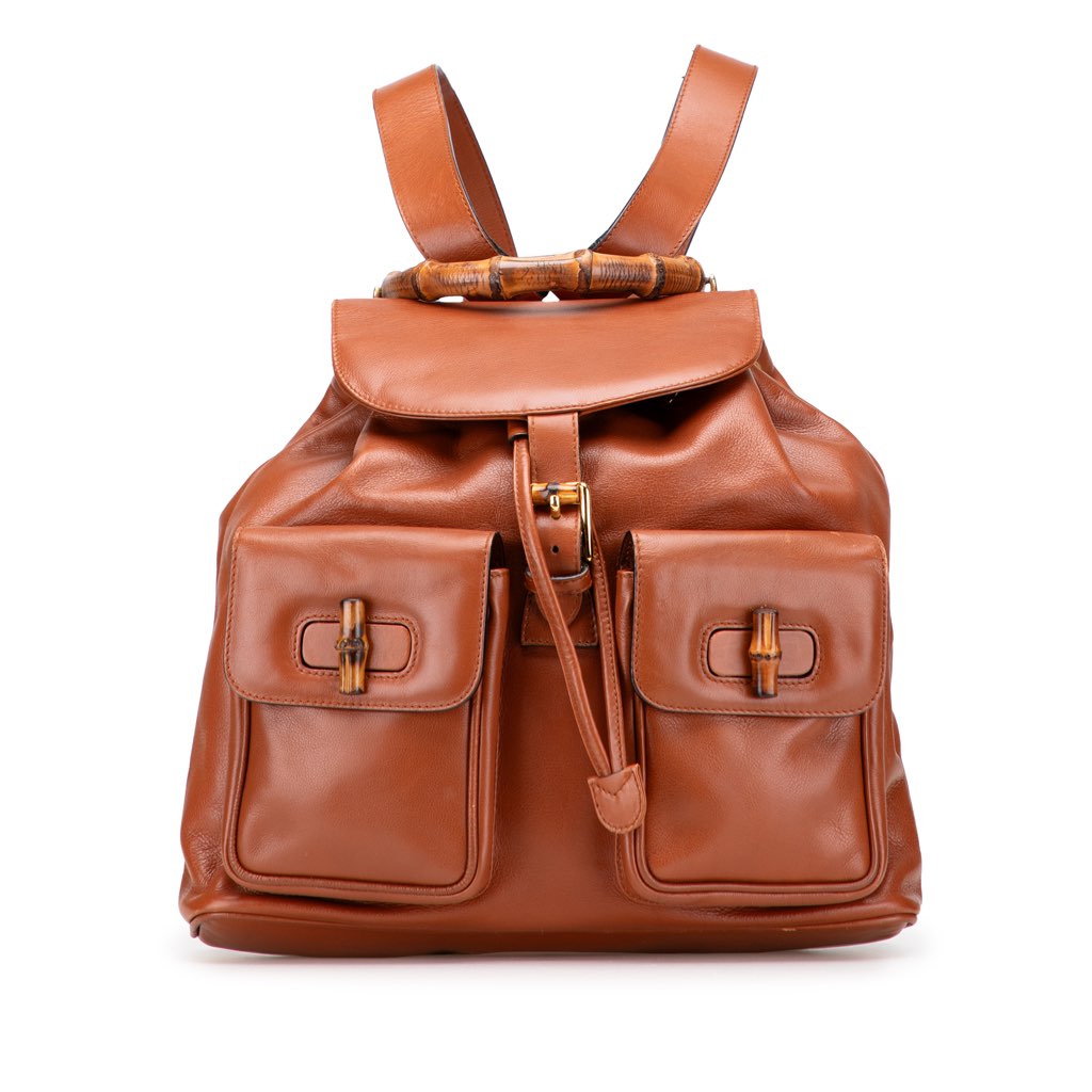 This backpack features a leather body, a bamboo top handle, adjustable flat back straps, a top flap with buckle closure, a drawstring closure, exterior front flap pockets with bamboo twist lock closure, and an interior zip pocket.