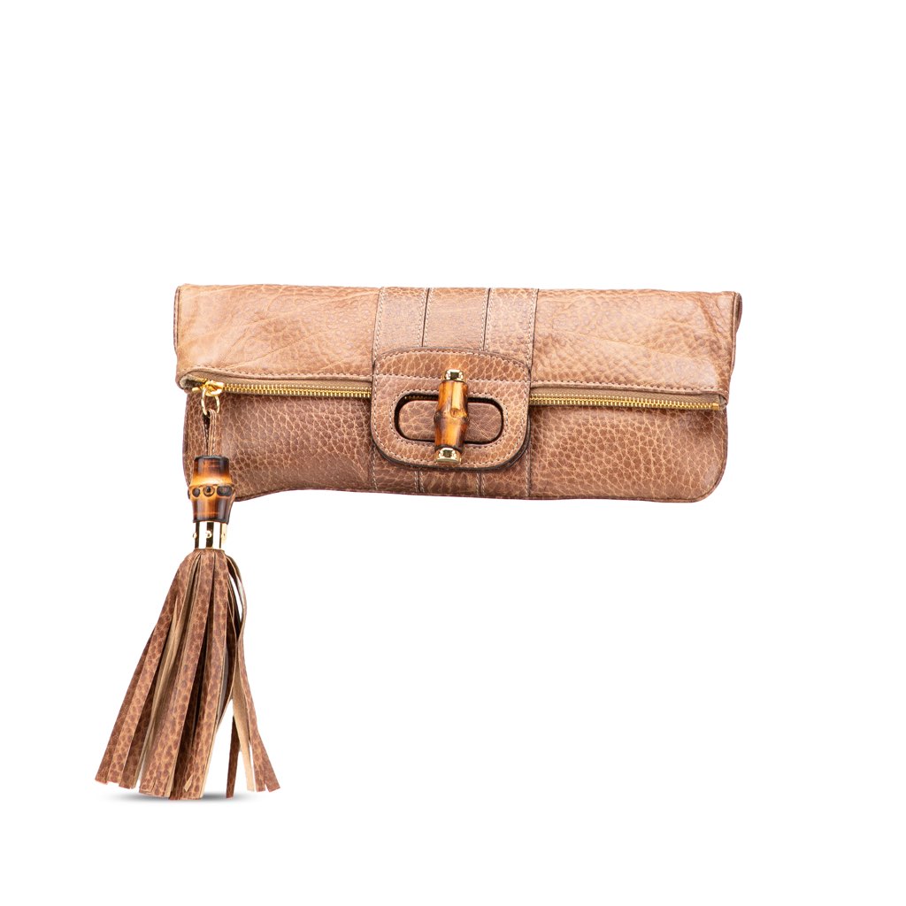 This clutch bag features a leather body, a fold over flap with zip and bamboo twist lock closure, and an interior slip pocket.