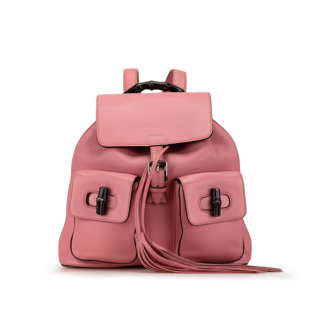 This backpack features a leather body, a bamboo top handle, adjustable flat leather back straps, a top drawstring closure with tassel pulls,, a front flap with buckle closure, exterior flap pockets with bamboo turn-lock closures, and interior slip pockets.