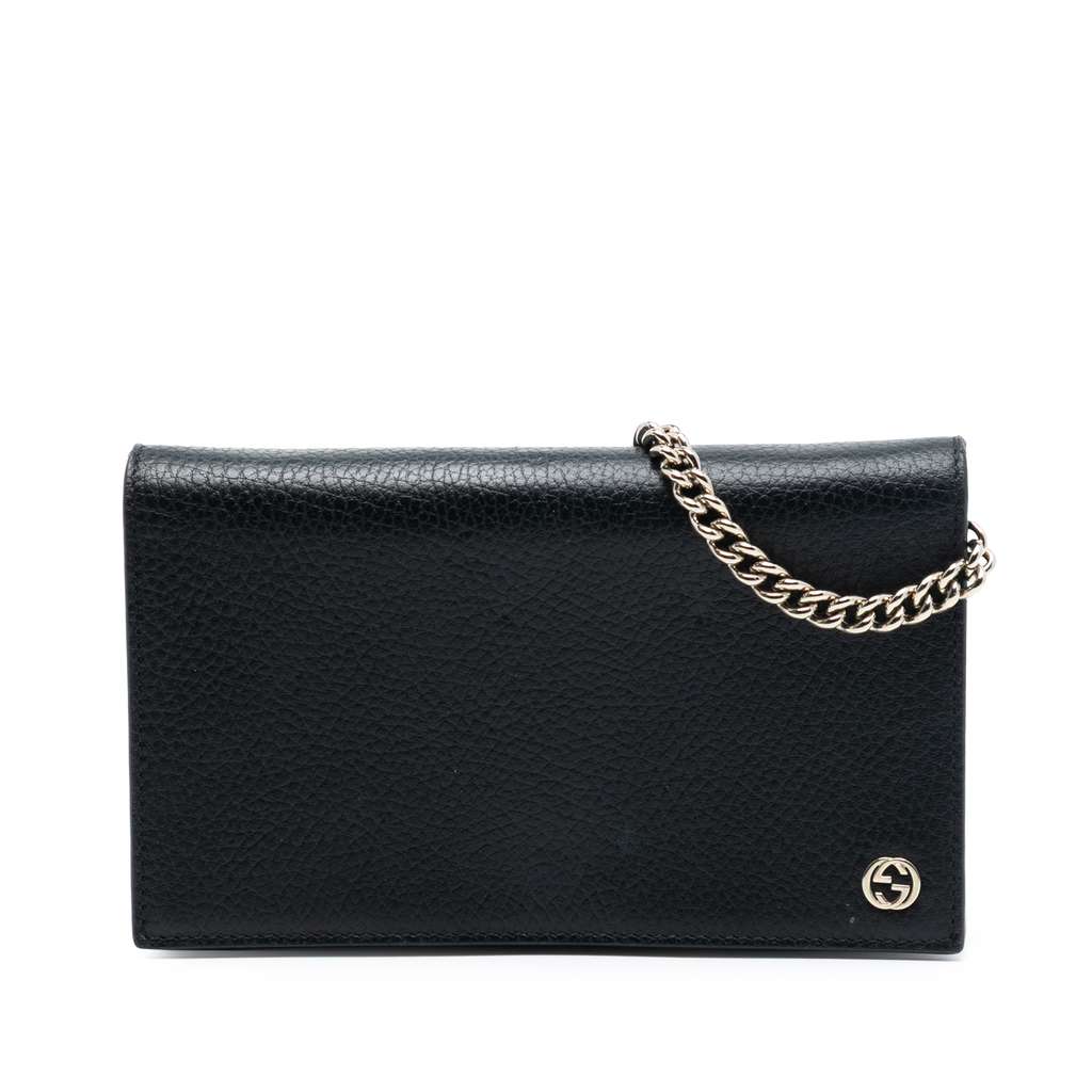 The Betty Wallet on Chain features a leather body, a chain-link shoulder strap, a front flap with magnetic snap closure, and interior zip and slip compartments.