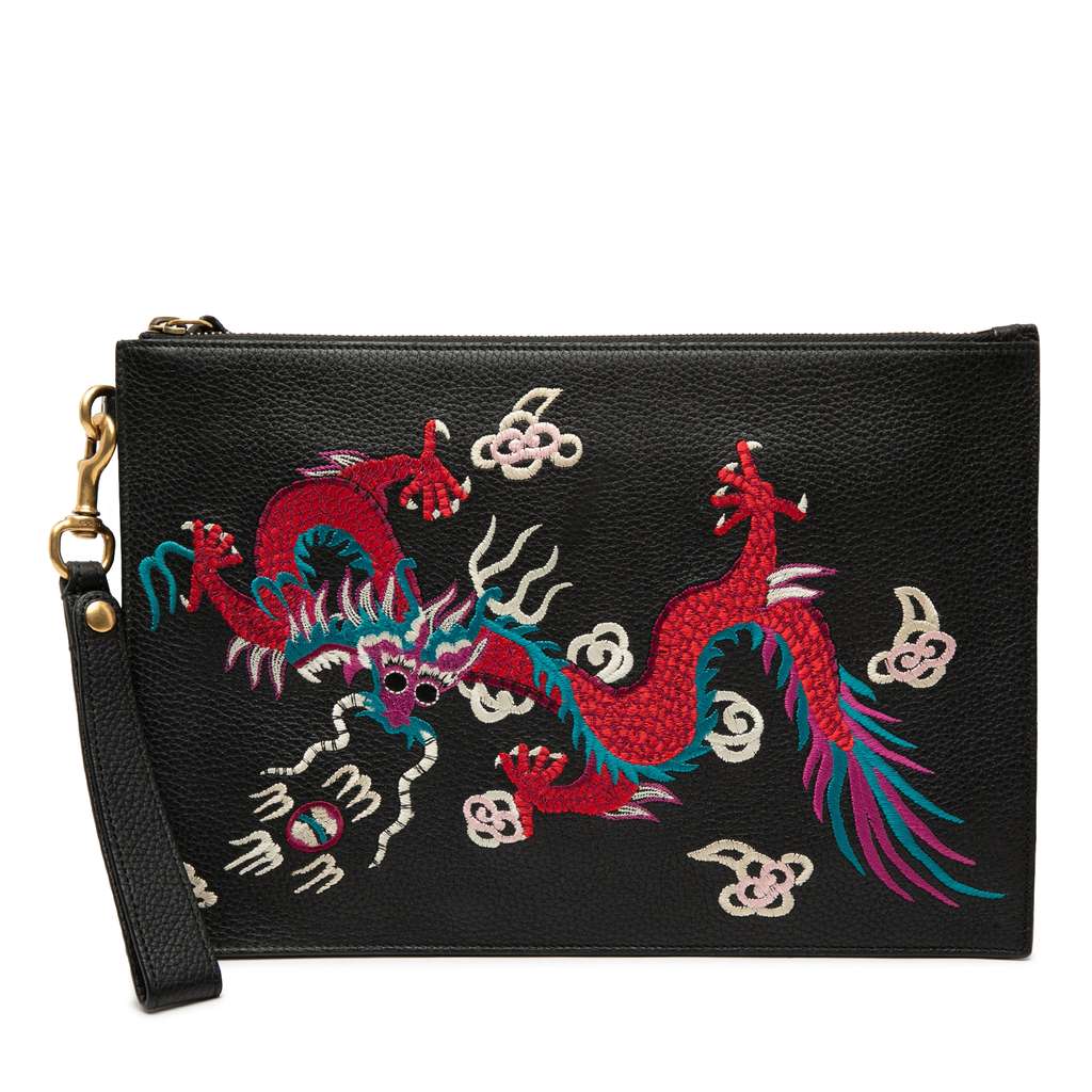 Gucci Leather Dragon Embroidered Zip Pouch Black Large Leath