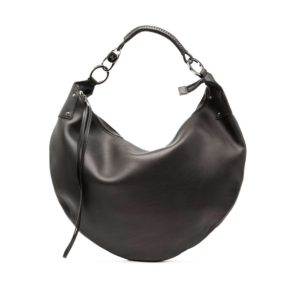 This hobo bag features a leather body, a rolled leather handle with chain details, a top zip closure, and an interior zip pocket.