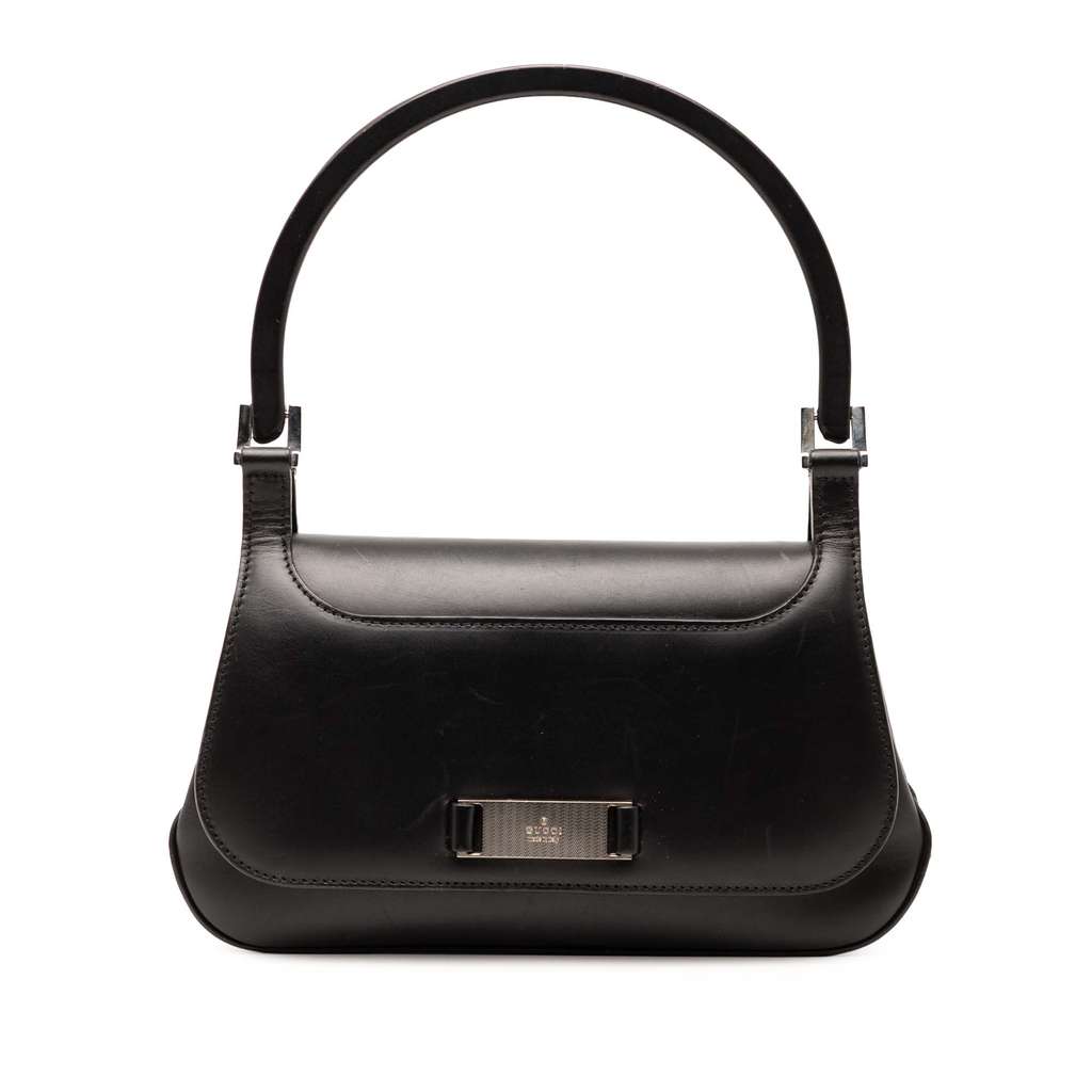 This handbag features a leather body, a rolled top handle, a front flap with magnetic closure, and an interior zip pocket.