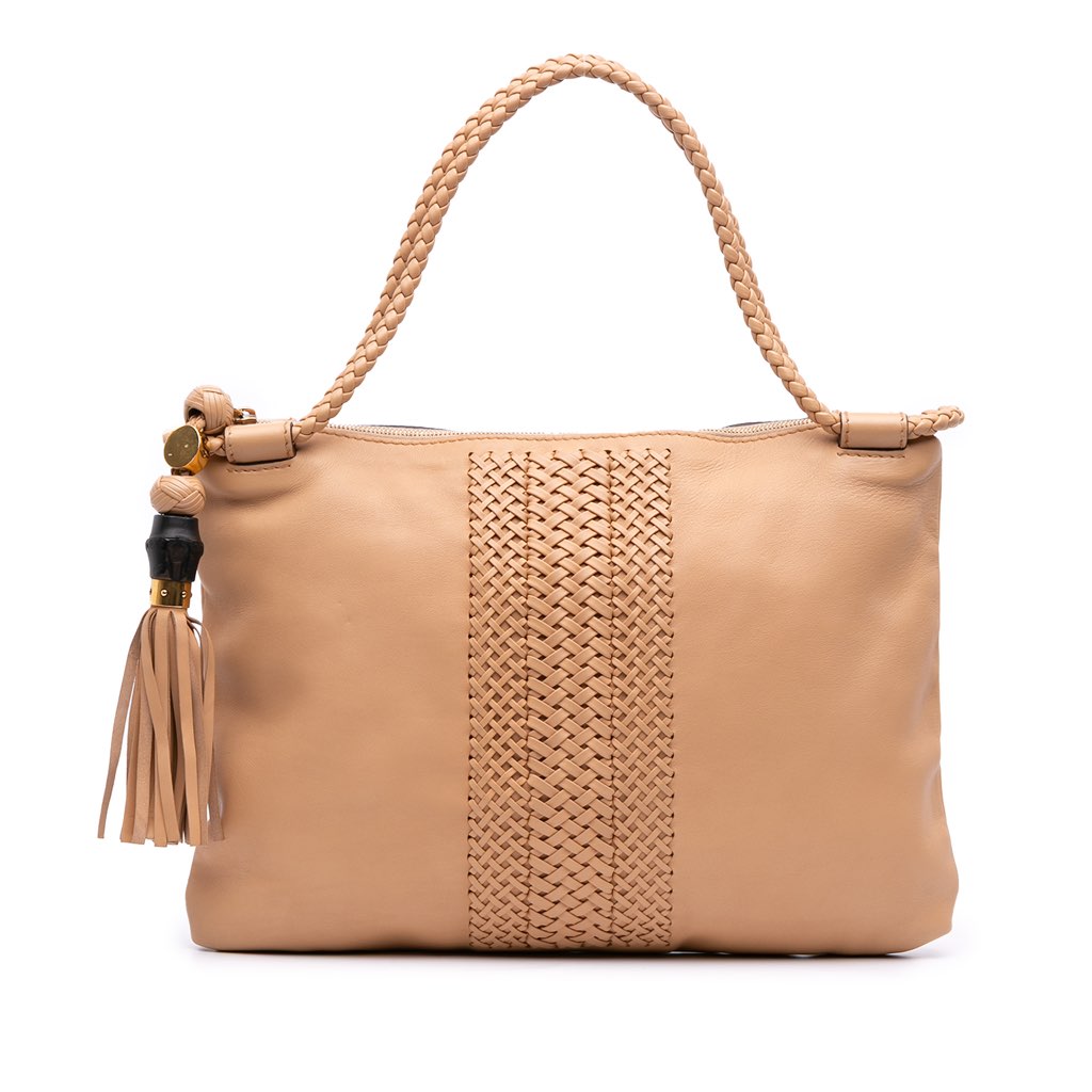 This tote bag features a leather body with woven leather details, rolled braided leather handles, a bamboo tassel, a top zip closure, and interior zip and slip pockets.