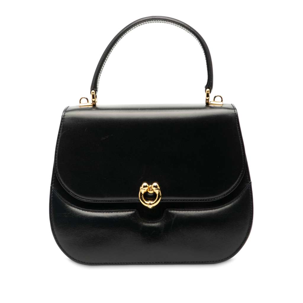 This handbag features a leather body, a flat leather top handle, a front flap with snap button closure, and interior zip and slip pocket.