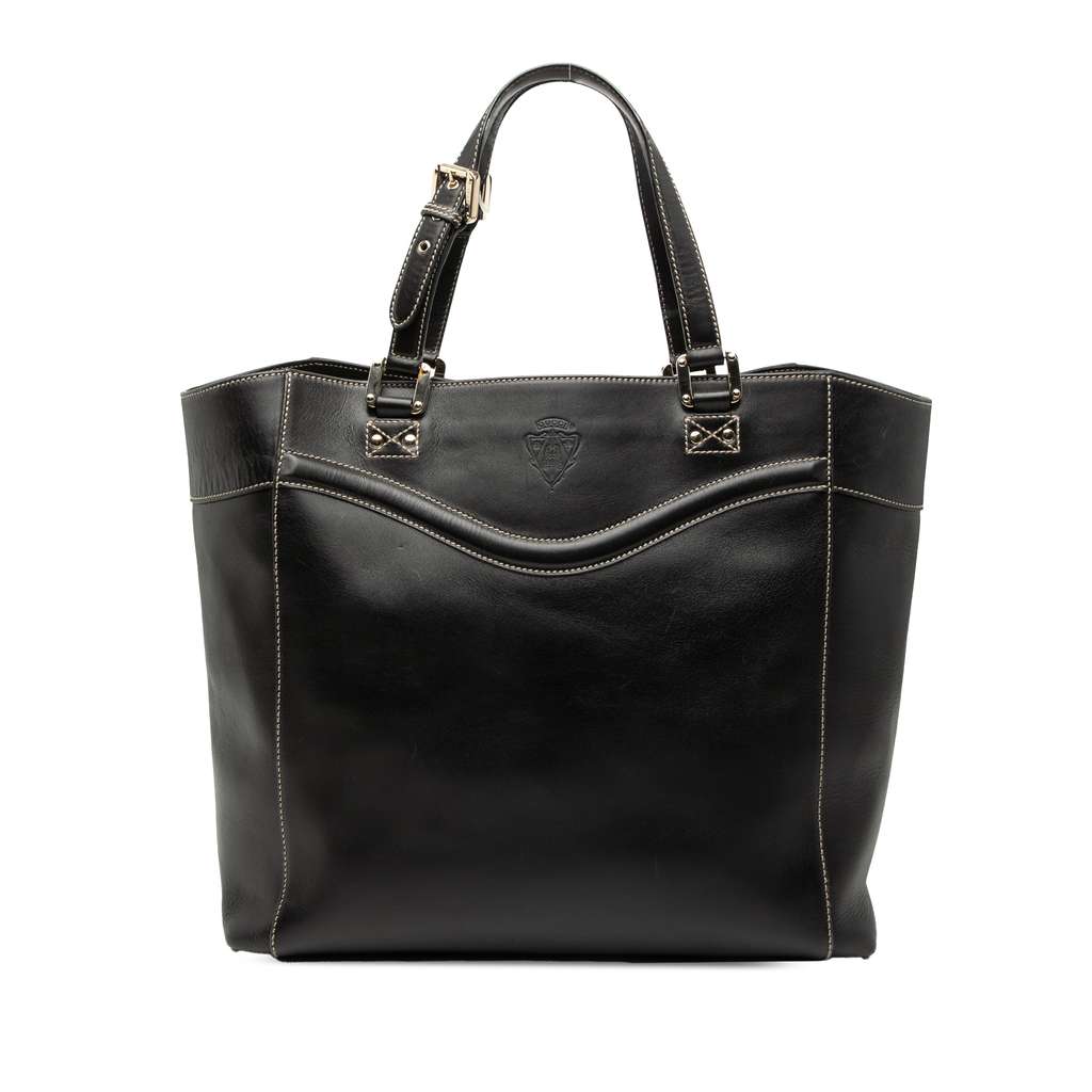 This tote bag features a leather body, flat leather strap, an open top, and interior zip and slip pockets.