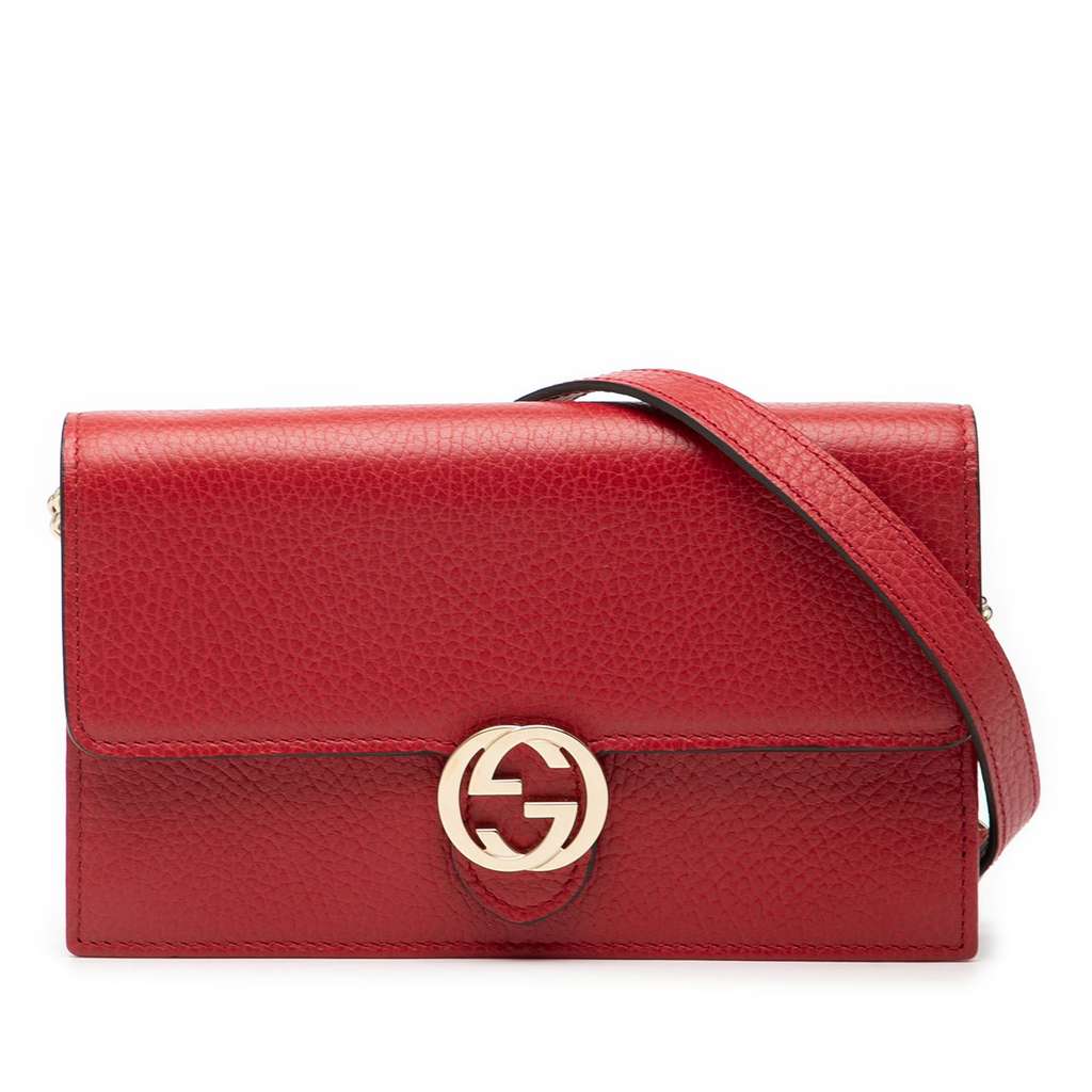 This wallet on chain features a leather body, a chain-link strap with leather guard, a flap with magnetic button closure, and interior zip and slip pockets.