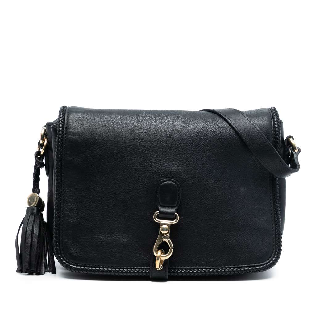 The Marrakech crossbody bag features a leather body, a tassel detail, a flat strap, a front flap with clasp closure, interior compartments, and interior zip and slip pockets.