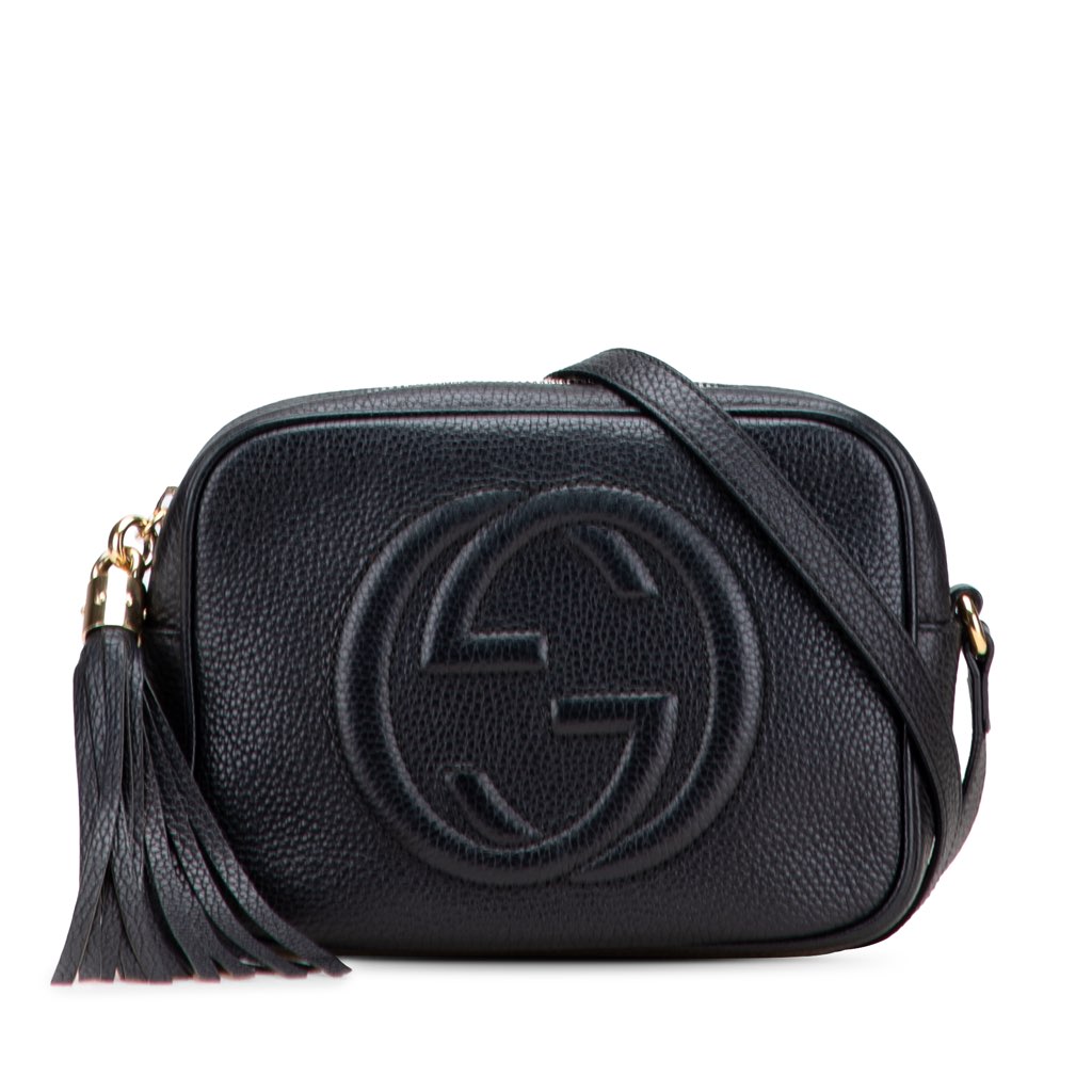 The Soho Disco crossbody bag features a leather body, an adjustable flat leather strap, a tassel detail, a top zip closure, and interior slip pockets.