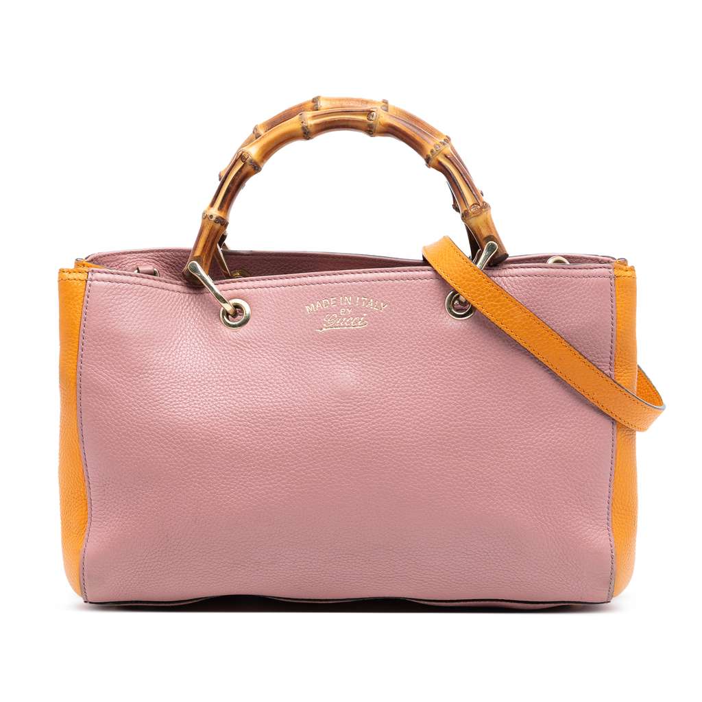 The Bamboo Shopper features a bicolor leather body, bamboo top handles, a detachable flat leather strap, an open top with magnetic snap closure, interior zip and slip compartments, and interior zip and slip pockets.