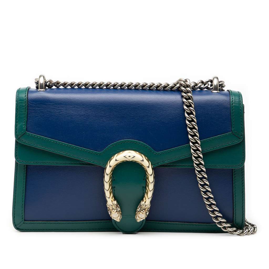 The Dionysus Crossbody Bag features a leather body, a detachable silver-toned chain link strap, a front flap with snap closure, and interior zip and slip compartments.
