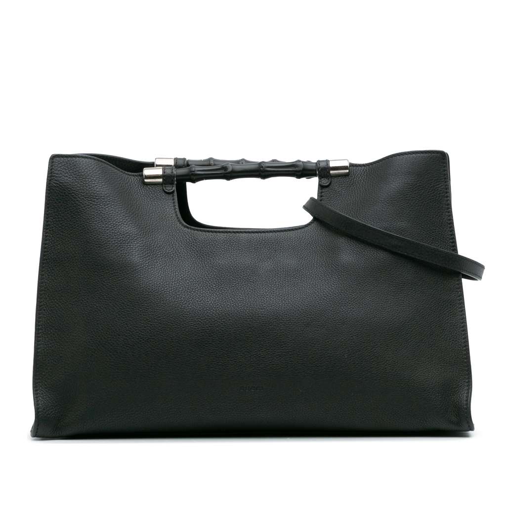This satchel features a leather body, bamboo handles, a detachable flat strap, an open top, an interior zip compartment, and interior zip pockets.