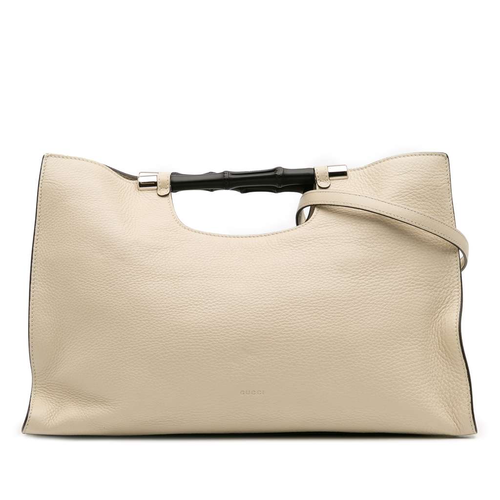 The Daily satchel features a leather body, bamboo handles, a detachable flat strap, an open top, interior zip and slip compartments, and interior zip pockets.