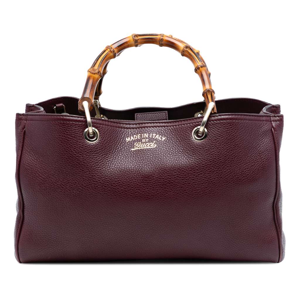 The Bamboo Shopper satchel features a leather body, bamboo top handles, a detachable flat leather strap, an open top with a magnetic closure, an interior zip compartment, and interior zip and slip pockets.