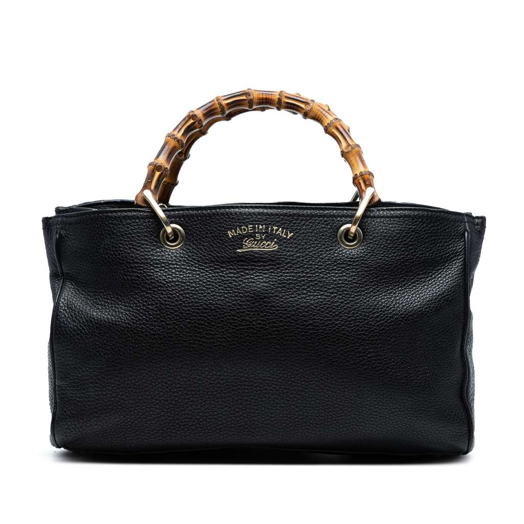 The Bamboo Shopper satchel features a leather body, bamboo top handles, a detachable flat leather strap, an open top with magnetic snap closure, and interior zip and slip pockets.