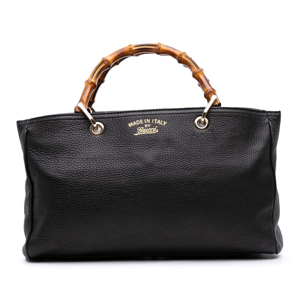 The Bamboo Shopper satchel features a leather body, bamboo top handles, an open top with a magnetic closure, an interior zip compartment, and interior zip and slip pockets.