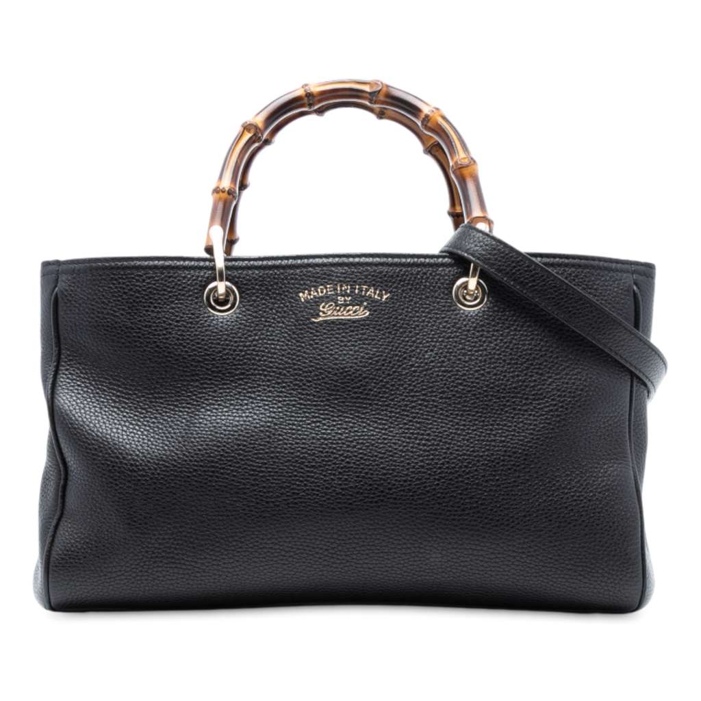 The Bamboo Shopper satchel features a leather body, bamboo top handles, a detachable flat leather strap, an open top with a magnetic closure, and interior zip and slip pockets.