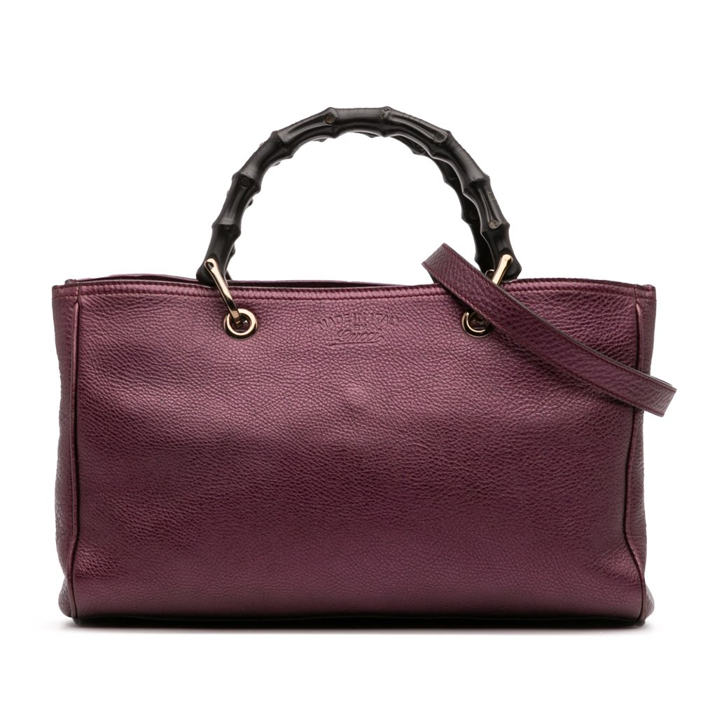 This satchel bag features a leather body, bamboo top handles, a flat leather strap, an open top with a magnetic closure, and interior zip and slip pockets.
