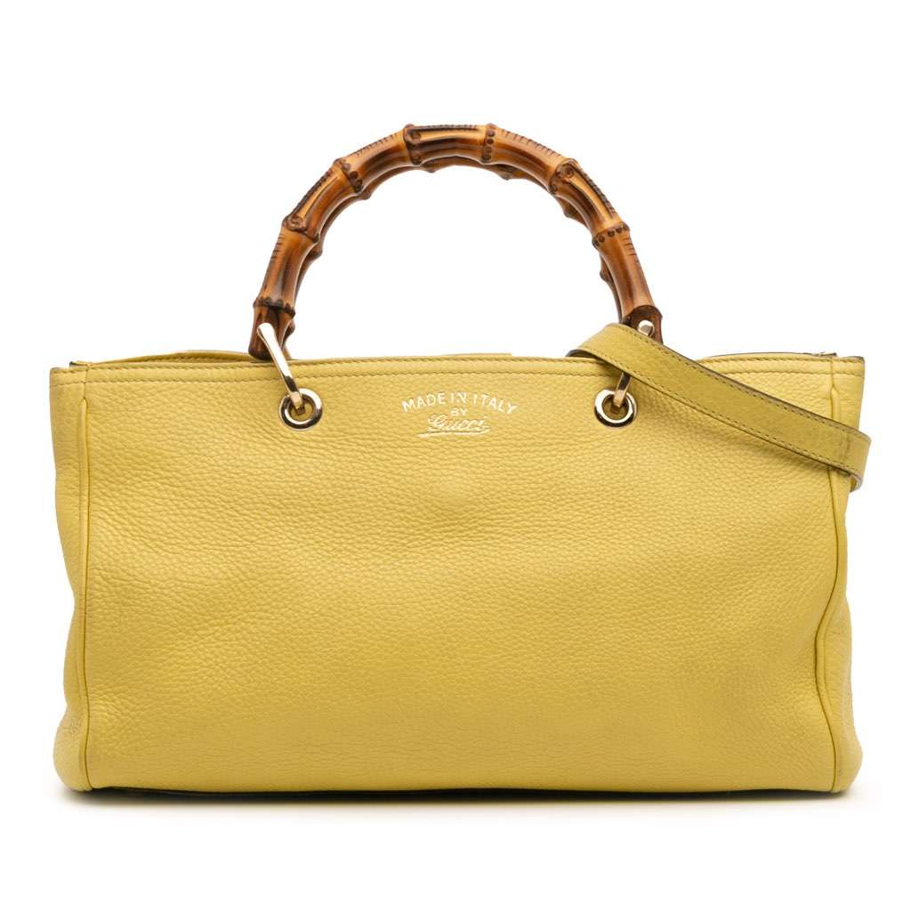 The Bamboo Shopper features a leather body, bamboo top handles, a detachable flat leather strap, an open top with magnetic snap closure, an interior zip compartment, and interior zip and slip pockets.