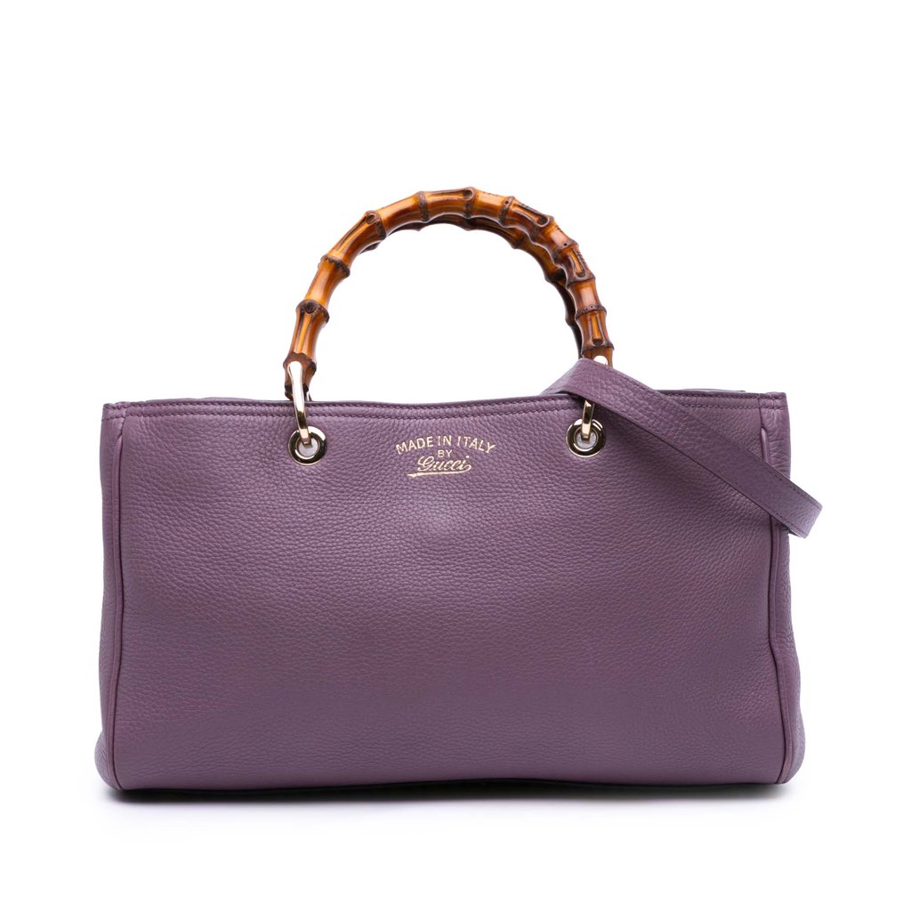 The Bamboo Shopper satchel features a leather body, bamboo top handles, a detachable flat leather strap, an open top with a magnetic snap closure, interior zip and slip compartments, and interior zip and slip pockets.