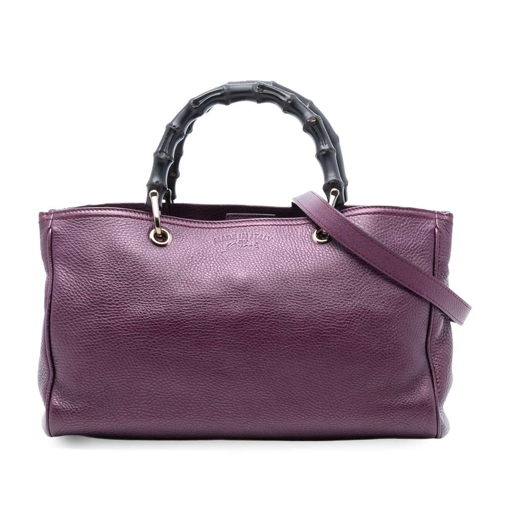 The Bamboo Shopper features a leather body, bamboo top handles, a detachable strap, an open top with magnetic snap closure, and interior zip and slip pockets.