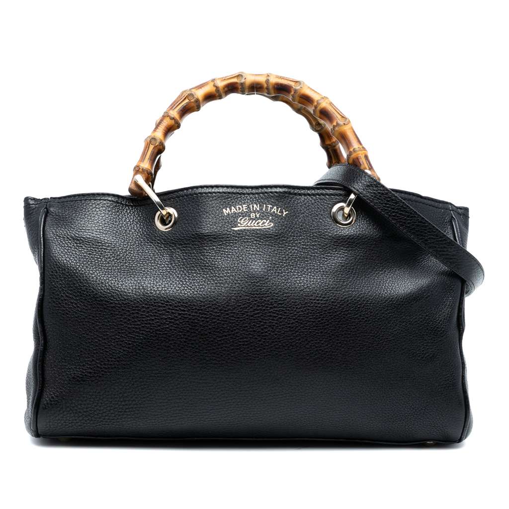 The Bamboo Shopper satchel features a leather body, bamboo top handles, a detachable flat leather strap, an open top with a magnetic snap closure, interior zip and slip compartments, and interior zip and slip pockets.