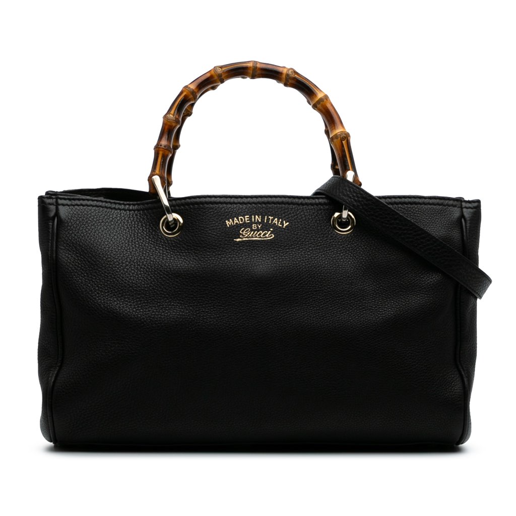 The Bamboo Shopper satchel features a leather body, bamboo top handles, a detachable flat leather strap, an open top with a magnetic closure, and interior zip and slip pockets.