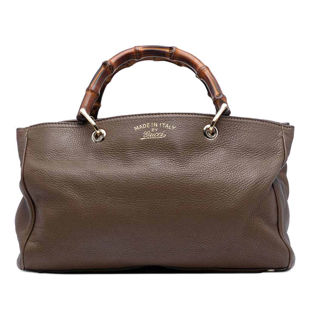 The Bamboo Shopper satchel features a leather body, bamboo top handles, a detachable flat leather strap, an open top with a magnetic closure, interior zip and slip compartments, and an interior zip and slip pockets.