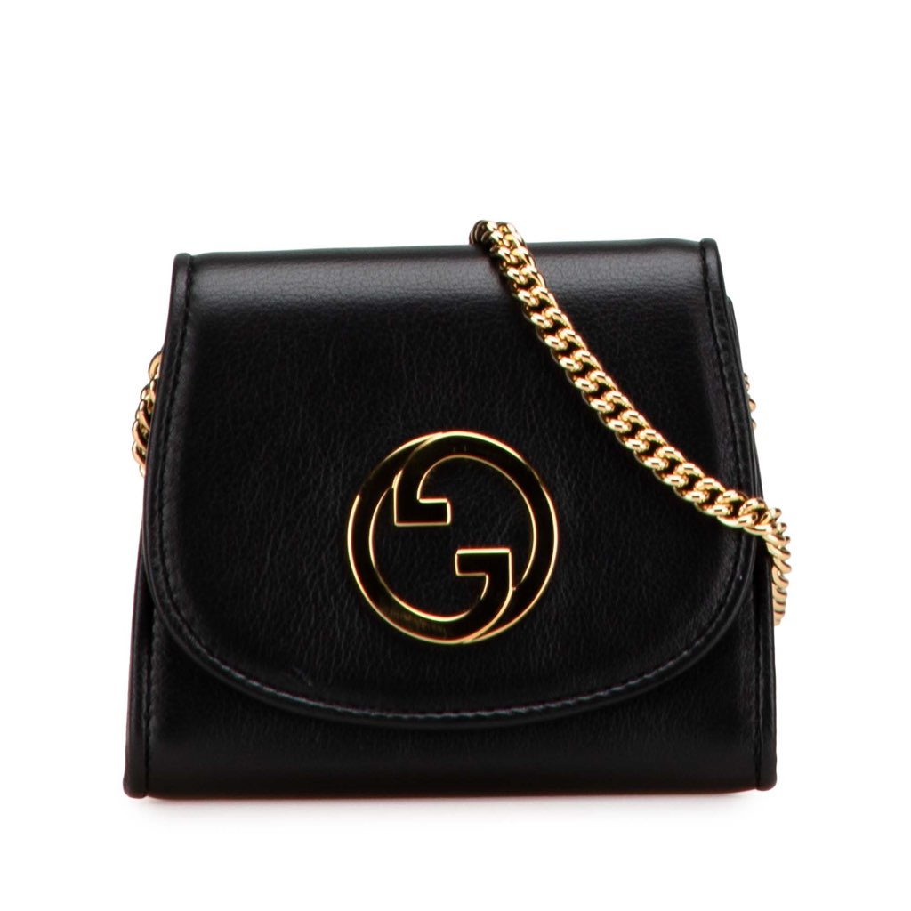 The Blondie wallet on chain features a leather body, a chain link shoulder strap, and a front flap with magnetic snap closure, interior zip and slip compartments, and interior slip pockets.