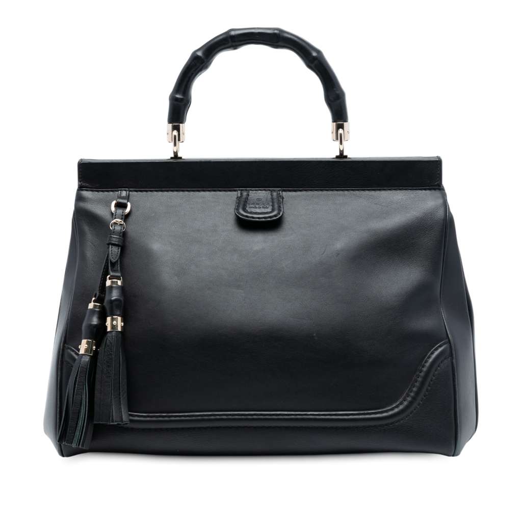 The Bamboo features a leather body, a bamboo top handle, a top snap closure, and interior zip and slip pockets.