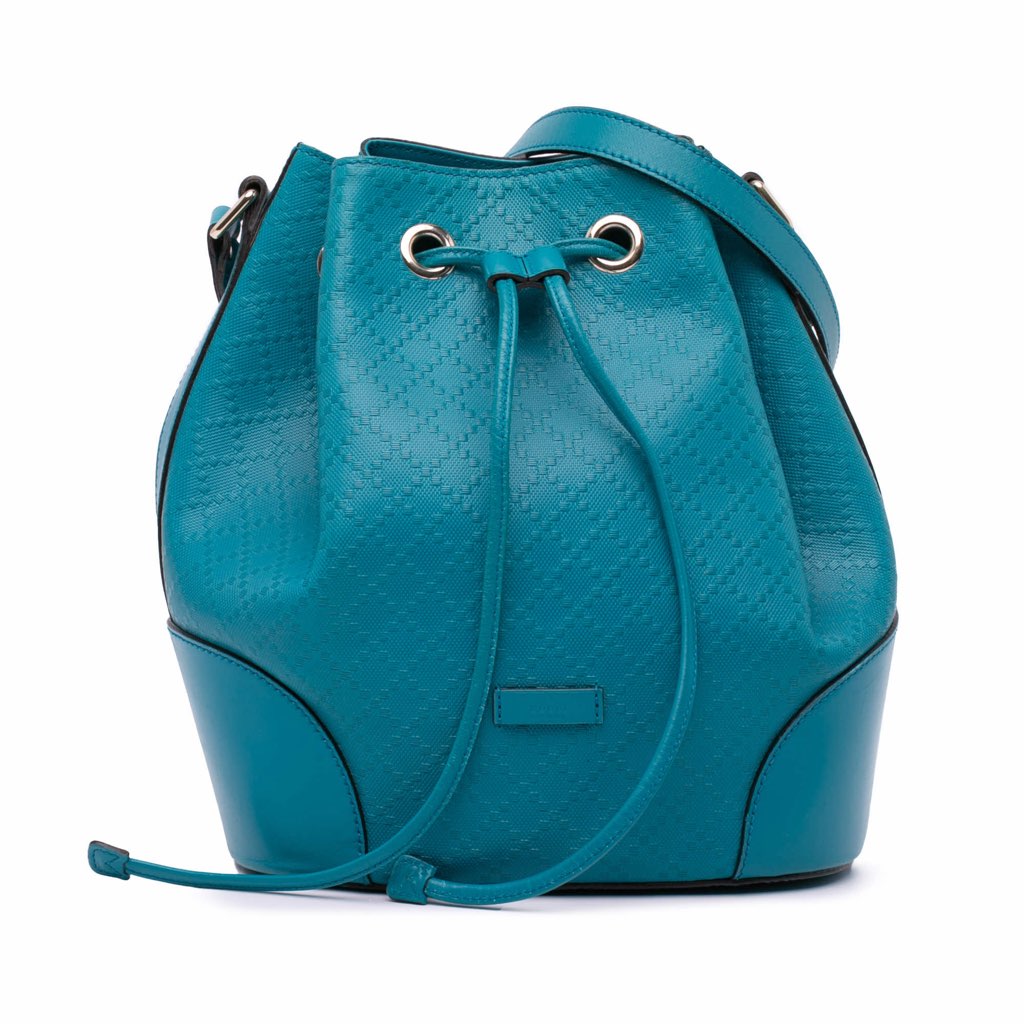 This bucket bag features a calf leather body, an adjustable flat leather strap, an open top with drawstring closure, and interior zip and slip pockets.