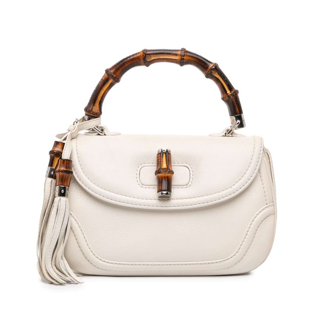 The New Bamboo satchel features a leather body, a bamboo top handle, leather tassel details, a front flap with a bamboo twist lock closure, and interior zip and slip pockets.