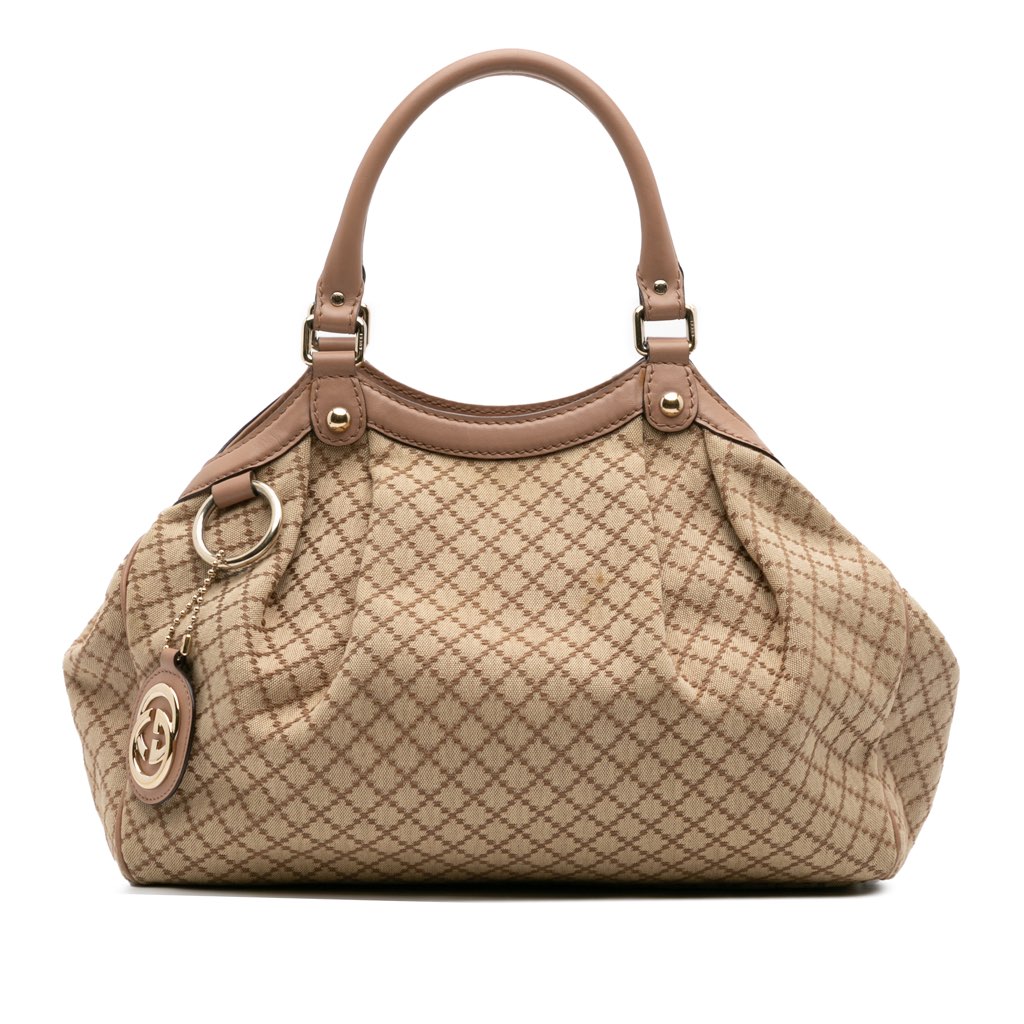 The Sukey features a canvas body with leather trim, rolled leather handles, an open top with magnetic snap closure, and an interior zip pocket.