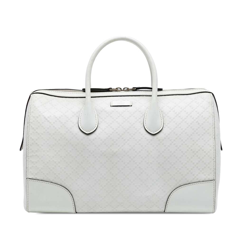 This boston bag features an embossed leather body, rolled leather top handles, a top zip closure, and interior zip and slip pockets.