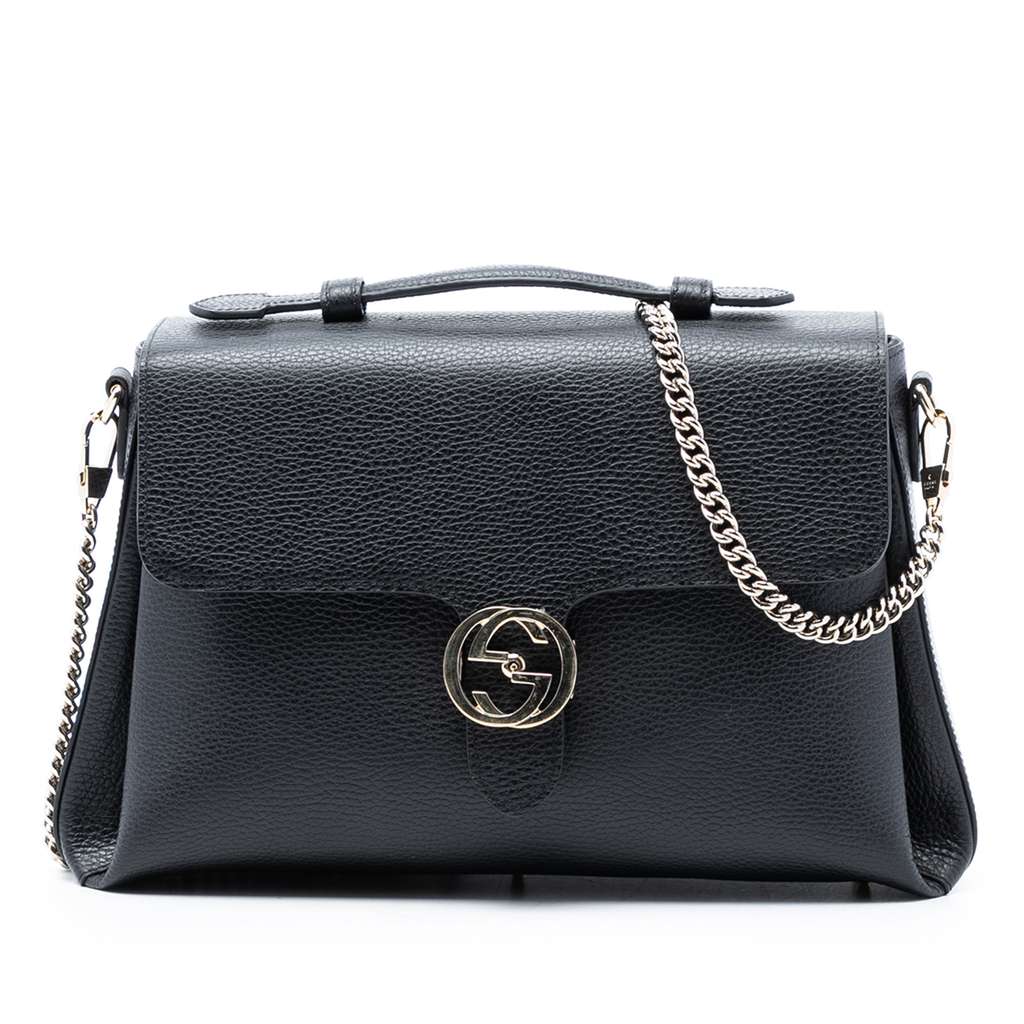 This satchel features a leather body, a flat leather top handle, a chain-link shoulder strap with leather guard, a front flap with silver-tone interlocking G flip-lock closure, and interior zip and slip pockets.