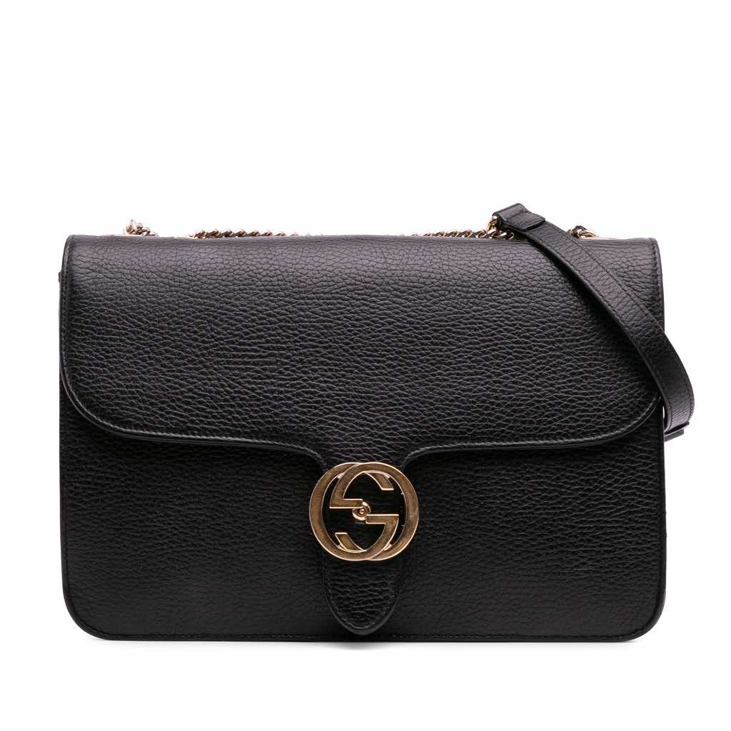 This crossbody bag features a leather body, a chain link strap with leather shoulder guard, a front flap with GG flip-lock closure, and an interior zip pocket.