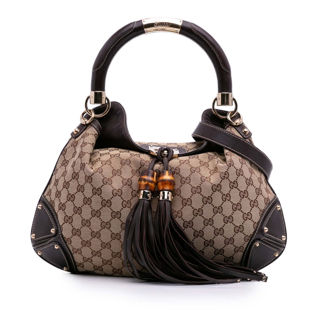 The Indy bag features a canvas body with leather trim, a rolled handle, an open top with bamboo and tassel toggle closure, and an interior zip pocket.