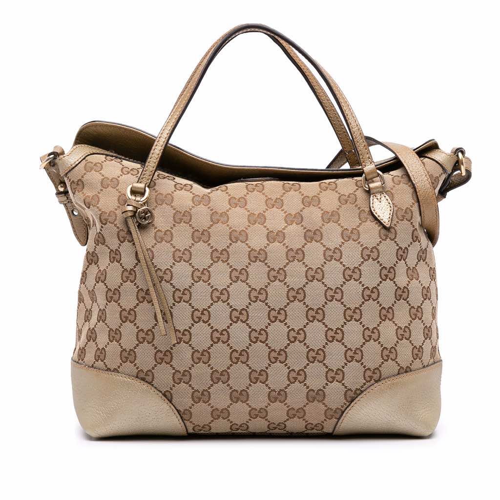 The Bree features a canvas body with leather trim, flat leather handles, a detachable flat leather strap, a fold-over top, and interior zip and slip pockets. The handles/straps were repainted.