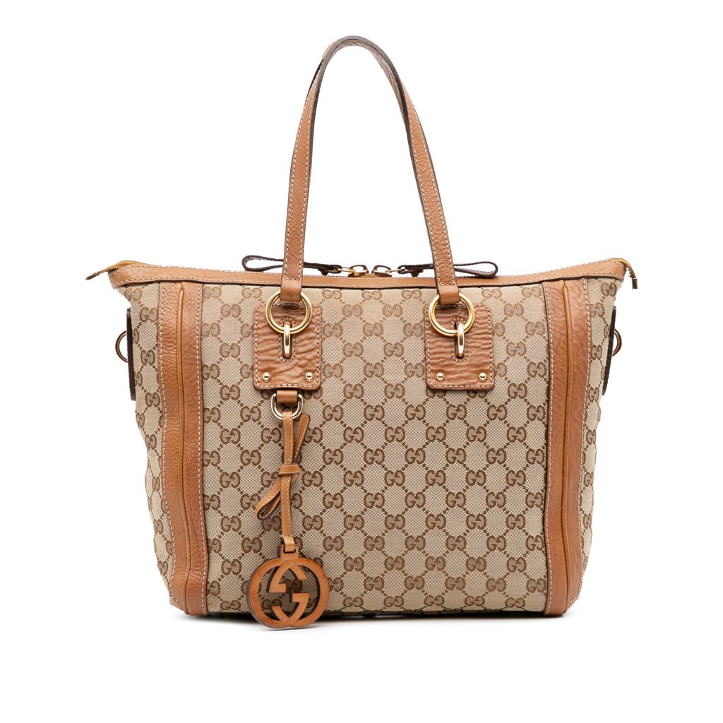 This satchel features a canvas body with leather trim, flat leather handles, a top zip closure, and interior zip and slip pockets.