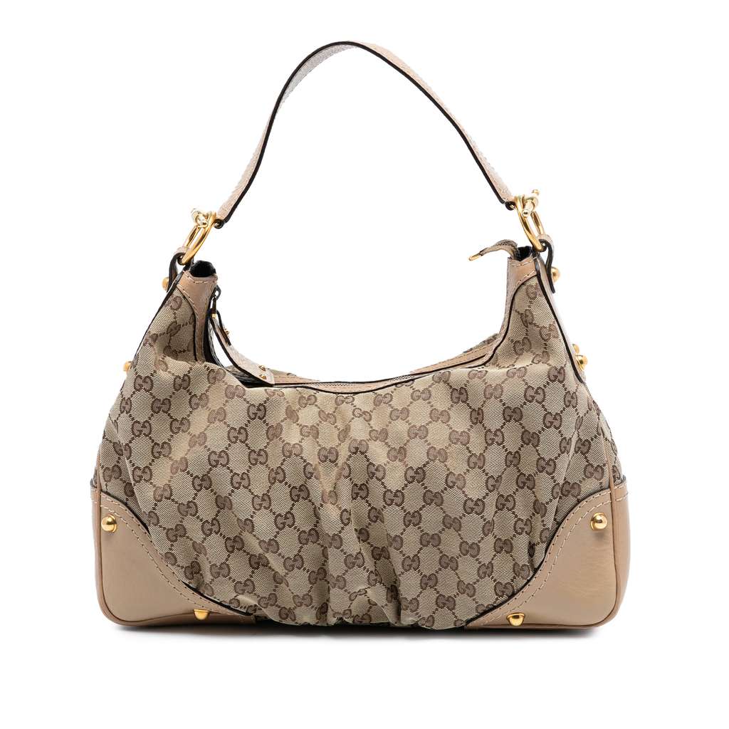 The Jockey hobo bag features a canvas body with leather trim, a flat leather strap, a top zip closure, and interior zip and slip pockets.