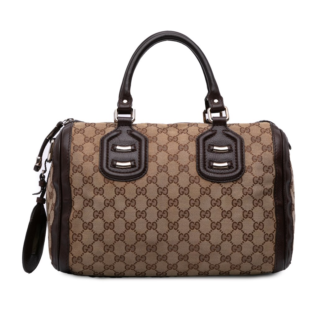 This boston bag features canvas body, rolled leather handles, and a top zip closure.